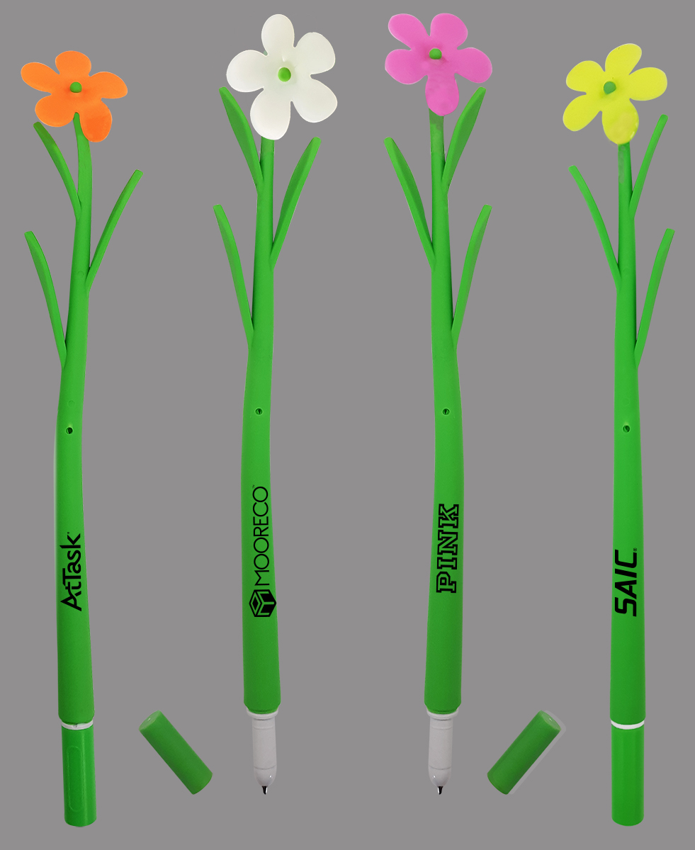 Impress them with this flower shaped ballpoint pen... Features a delightful & colorful flower on top of pen... Available in yellow, white, pink, and orange... Writes in blue ink... Length 6.5"...Please note white flower only will change color when in sunlight to light blue. Ideal for trade shows and promotions related to the environment, Valentine's Day, gardens and more... Eco friendly, made from 100% recyclable materials. |